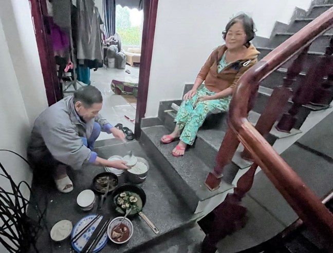 Suốt 3 ngày qua, ngôi nhà của chị Trần Thị Kim Liên (thôn Khánh Bình, xã Quế Phước) đã trở thành nơi trú ngụ của gần 10 gia đình trong làng (chủ yếu người già và trẻ em). Tại đây, mọi người cùng ăn chung bữa cơm với gia chủ và chia nhau từng chỗ ngủ. Chị Kim Liên chia sẻ, nhà mình may mắn nằm ở vị trí tương đối cao so với nhiều nhà khác nên muốn bà con cùng tới trú tránh lũ nhằm đảm bảo an toàn. Dù vậy, đến sáng 29/10 nước cũng đã ngập vào nhà hơn nửa mét, các gia đình lại tiếp tục di chuyển lên gác lửng và sân thượng ngôi nhà.