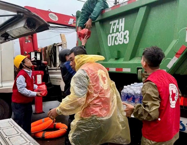 | Hội Chữ thập đỏ tỉnh Gia Lai vận chuyển mì tôm, nước uống, nhờ lực lượng chức năng đưa đến người dân ở vùng bị cô lập. Ảnh: ĐVCC |