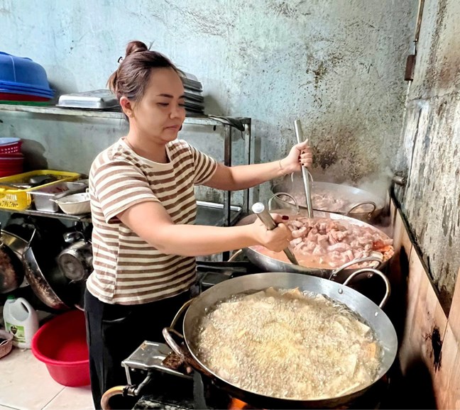 | Sáng 20/11, tại căn nhà số 2 Hai Bà Trưng (phường Quy Nhơn), gia đình chị Nguyễn Phạm Thanh Hoàng đỏ lửa từ rất sớm, nấu 200 suất xôi nóng để gửi đến bà con vùng lũ. Ảnh: Hải Yến |