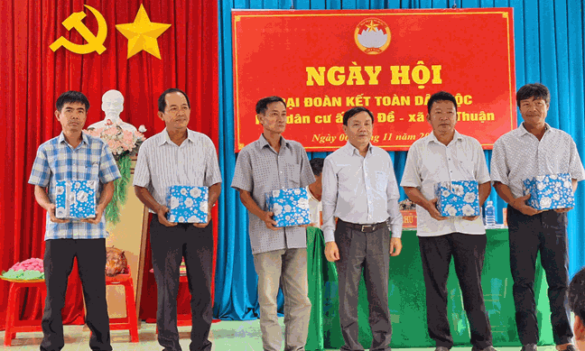 | Đồng chí Phan Văn Thắng, Phó Bí thư Tỉnh ủy, Chủ tịch Ủy ban Mặt trận Tổ quốc Việt Nam tỉnh Đồng Tháp trao quà cho các cá nhân tiêu biểu tại Ngày hội Đại đoàn kết dân tộc, Khu dân cư ấp Bồ Đề, xã Gia Thuận. |