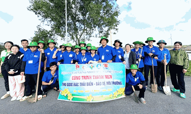 | Đoàn viên, thanh niên xã Gia Thuận thực hiện công trình thu gom rác thải biển, bảo vệ môi trường. |