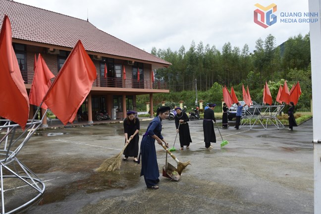 | Người dân thôn Bản Cáu, xã Lục Hồn, tham gia vệ sinh khuôn viên nhà văn hóa xã |