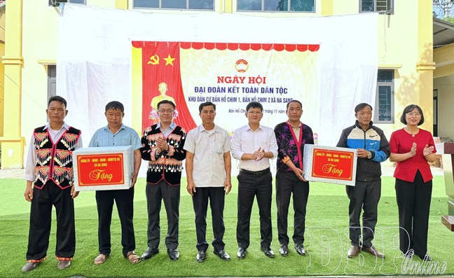 | Thường trực Đảng ủy xã Na Sang tặng quà chúc mừng khu dân cư bản Hồ Chim 1 và bản Hồ Chim 2 |