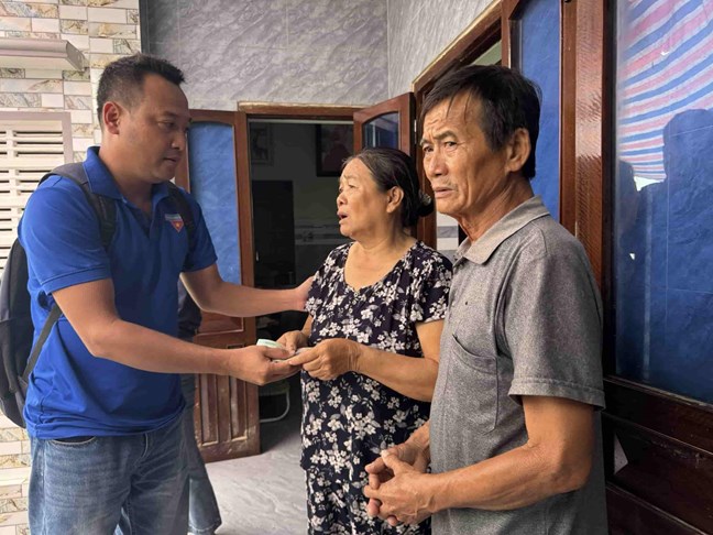 | Phóng viên Thông Tấn xã chuyển tiền hỗ trợ của các mạnh thường quân đến gia đình. Ảnh: Hữu Long |