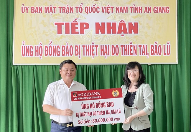 Sáng 16/10, ông Phạm Minh Tấn, Giám đốc Agribank Chi nhánh Kiên Giang II đại diện cán bộ, người lao động đơn vị trao tặng 82 triệu đồng để ủng hộ đồng bào bị thiệt hại do thiên tai, bão lũ thông qua Ủy ban MTTQ Việt Nam tỉnh An Giang.
