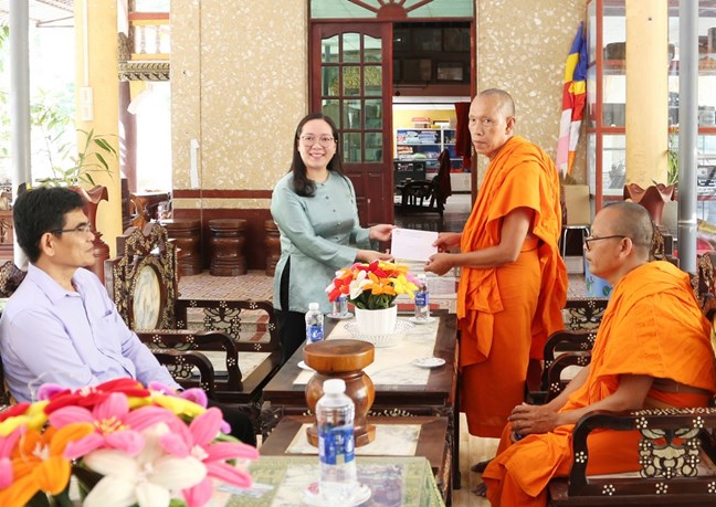 Bà Nguyễn Thị Hồng Nhung, Ủy viên Ban Thường vụ Tỉnh ủy, Phó Chủ tịch Thường trực Ủy ban MTTQ Việt Nam tỉnh tặng quà Chôl Chnăm Thmây Hòa thượng Thạch Sok Xane