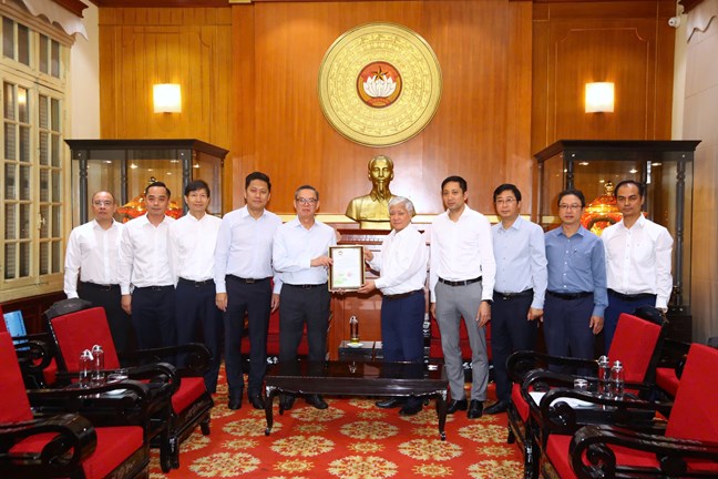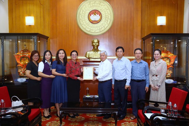 | Chủ tịch Ủy ban Trung ương MTTQ Việt Nam Đỗ Văn Chiến tiếp nhận và trao thư cảm ơn Ngân hàng VietinBank |