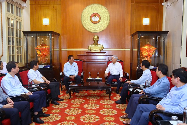 | Chủ tịch Ủy ban Trung ương MTTQ Việt Nam Đỗ Văn Chiến trao đổi với Bộ trưởng Bộ Xây dựng Trần Hồng Minh |