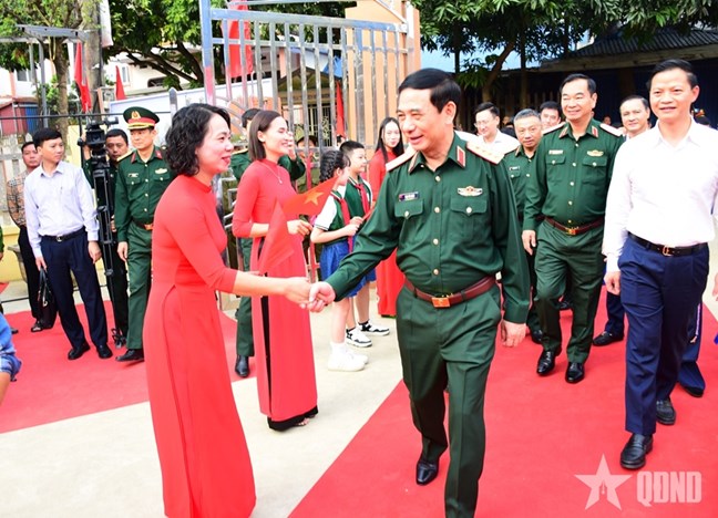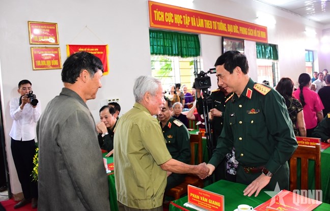 Trong không khí vui tươi, phấn khởi của ngày hội, Đại tướng Phan Văn Giang và các đồng chí lãnh đạo Bộ Tổng Tham mưu Quân đội nhân dân Việt Nam, Tổng cục Chính trị Quân đội nhân dân Việt Nam trao 100 suất quà tặng các gia đình chính sách, gia đình hộ nghèo, cận nghèo, có hoàn cảnh khó khăn, gia đình bị ảnh hưởng bởi bão lũ trên địa bàn.