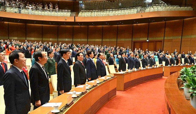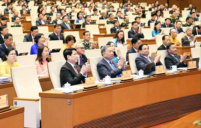 | Tổng Bí thư Tô Lâm, Chủ tịch nước Lương Cường, Thủ tướng Phạm Minh Chính, Thường trực Ban Bí thư Trần Cẩm Tú và các đại biểu Quốc hội dự Kỳ họp thứ Mười. Ảnh: Lâm Hiển |