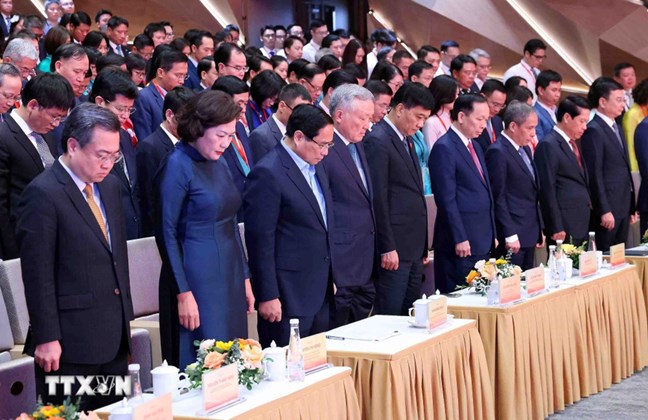 | Thủ tướng Phạm Minh Chính và các đại biểu dành phút tưởng niệm những nạn nhân thiệt mạng do bão lũ. Ảnh: Phạm Kiên/TTXVN |