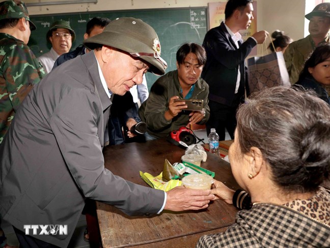 | Thường trực Ban Bí thư Trần Cẩm Tú thăm hỏi nhân dân xã Diên Điền, tỉnh Khánh Hoà ở nơi sơ tán. Ảnh: Phương Hoa/ TTXVN |