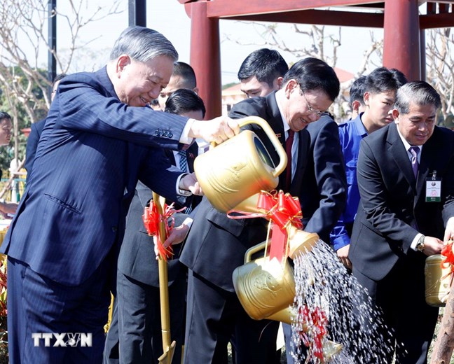 | Tổng Bí thư Tô Lâm cùng Tổng Bí thư, Chủ tịch nước Lào Thongloun Sisoulith trồng cây lưu niệm tại lễ khánh thành Công viên Hữu nghị Lào - Việt Nam. Ảnh: Thống Nhất/TTXVN |