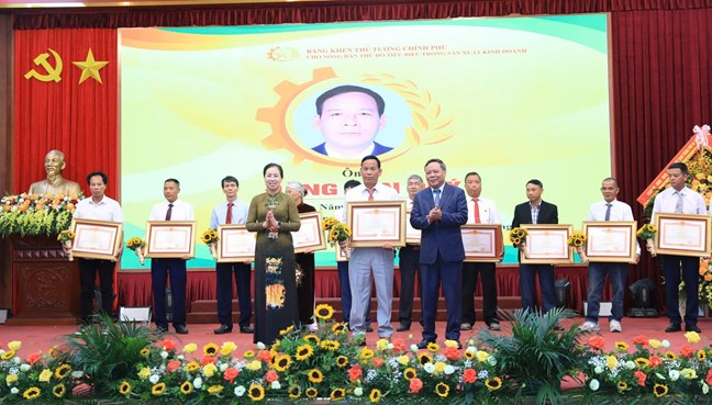 | Phó Chủ tịch Trung ương Hội Nông dân Việt Nam Bùi Thị Thơm và Phó Bí thư Thường trực Thành ủy Hà Nội Nguyễn Văn Phong trao Bằng khen của Thủ tướng cho 12 nông dân xuất sắc |