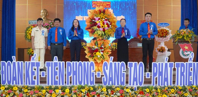 | Ủy viên Ban Thường vụ Tỉnh Đoàn, Phó Trưởng ban công tác Đoàn và phong trào thanh thiếu nhi cơ quan Ủy ban MTTQ Việt Nam tỉnh Nguyễn Thị Tố Mi (thứ 3, từ trái qua) tặng hoa chúc mừng Đại hội |