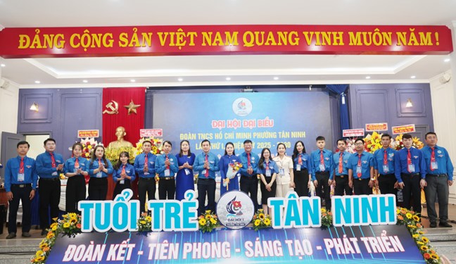 | Đại biểu lãnh đạo tặng hoa chúc mừng Ban Chấp hành Đoàn phường Tân Ninh, nhiệm kỳ 2025-2030 |
