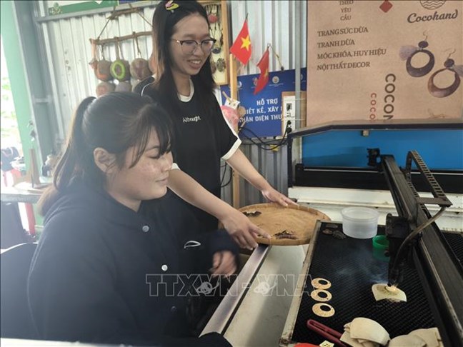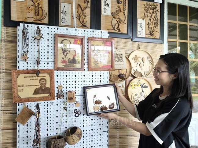 | Chị Nguyễn Băng Nhi, xã Hương Mỹ, tỉnh Vĩnh Long hướng dẫn hanh niên địa phương làm sản phẩm tranh từ gáo dừa |