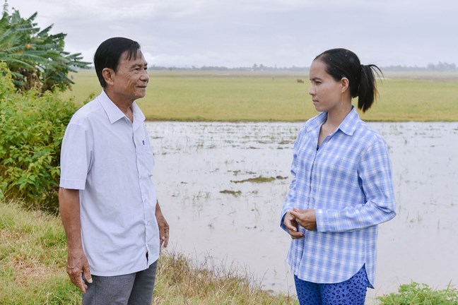 | Bí thư Chi bộ, Trưởng ấp Tà Teng Trần Văn Tính tuyên truyền lợi ích xây dựng nông thôn mới với chị Thị Sầm. |