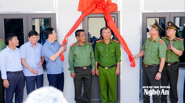 | Lãnh đạo Bộ Công an cùng tỉnh Nghệ An thực hiện nghi thức khánh thành, trao tặng trụ sở Công an xã Mỹ Lý. Ảnh: Phạm Bằng |