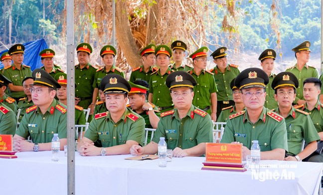 | Thượng tướng Phạm Thế Tùng - Thứ trưởng Bộ Công an cùng lãnh đạo các đơn vị trực thuộc Bộ Công an tham dự lễ phát động cao điểm 40 ngày đêm xây dựng nhà, trường học tặng bà con nhân dân và học sinh các xã miền Tây Nghệ An. Ảnh: Phạm Bằng |