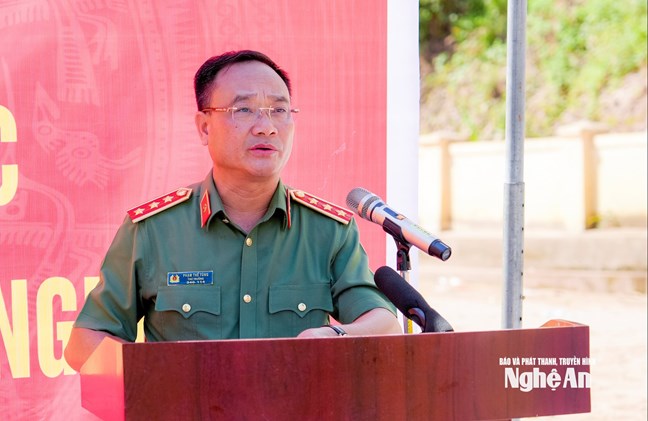 Phát biểu tại buổi lễ, Thượng tướng Phạm Thế Tùng - Thứ trưởng Bộ Công an thay mặt Đảng ủy Công an Trung ương, lãnh đạo Bộ Công an chia sẻ với những thiệt hại, mất mát của đồng bào các xã miền Tây Nghệ An nói chung và người dân xã Mỹ Lý nói riêng trong đợt mưa lũ vừa qua.
