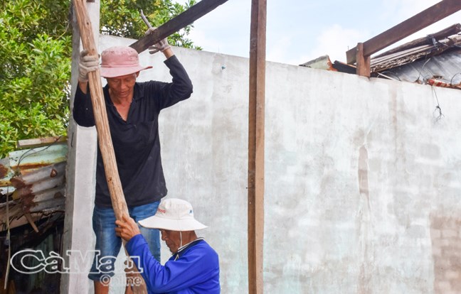 | Các lực lượng hỗ trợ tháo dỡ căn nhà cũ của bà Mận để tiến hành xây dựng lại |