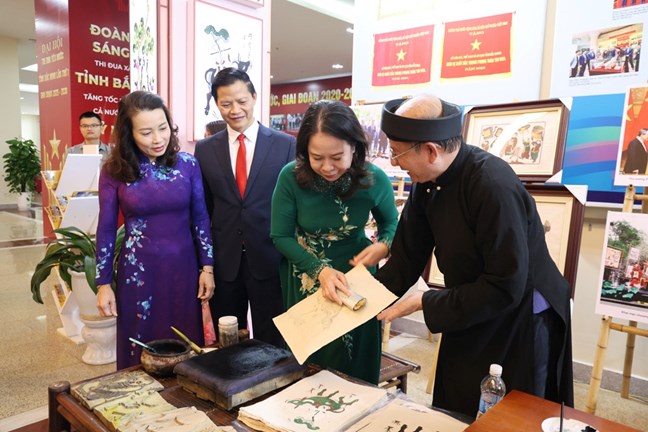 | Đồng chí Võ Thị Ánh Xuân trải nghiệm in tranh dân gian Đông Hồ |
