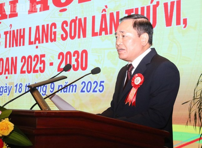 | Ông Hồ Tiến Thiệu, Phó Bí thư Tỉnh ủy, Chủ tịch Ủy ban nhân dân tỉnh Lạng Sơn trình bày báo cáo tại đại hội |
