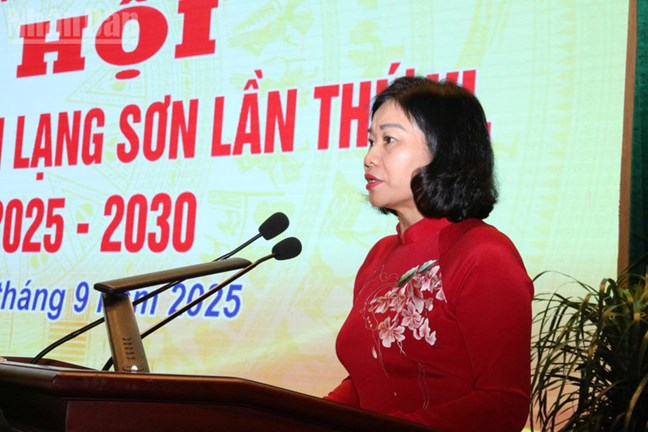 | Bà Đoàn Thị Hậu, Phó Bí thư Thường trực Tỉnh ủy, Chủ tịch Hội đồng nhân dân tỉnh Lạng Sơn phát biểu tại đại hội |