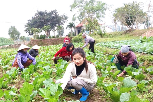 | Chị Nguyễn Ái Việt, Bí thư Chi bộ, Trưởng thôn Làng Nhội, xã Đông Ngũ chăm sóc rau màu. Ảnh: Nhân vật cung cấp |