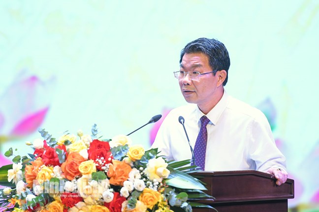 | Ông Trương Quốc Huy, Bí thư Tỉnh ủy, Trưởng Đoàn đại biểu Quốc hội tỉnh phát biểu tại hội nghị |