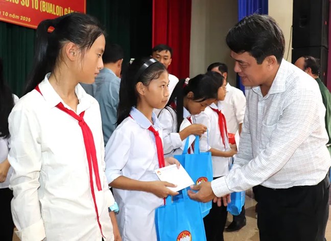 | Phó Chủ tịch Ủy ban MTTQ Việt Nam TPHCM, Chủ tịch Liên đoàn Lao động TPHCM Bùi Thanh Nhân trao quà đến học sinh khó khăn tại tỉnh Hà Tĩnh. Ảnh: THÁI PHƯƠNG |