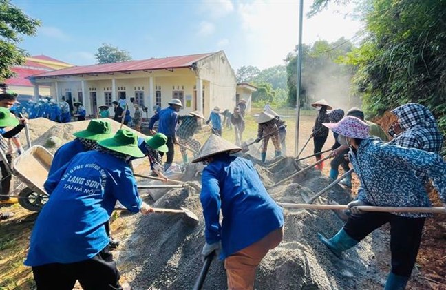 | Sinh viên tình nguyện tham gia xây dựng nông thôn mới tại xã Chiến Thắng, tỉnh Lạng Sơn. |