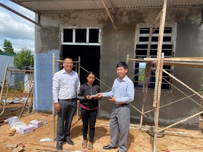 | Anh Trần Văn Năng (bìa trái) cùng lãnh đạo địa phương trao kinh phí hỗ trợ xóa nhà tạm, nhà dột nát cho người dân |