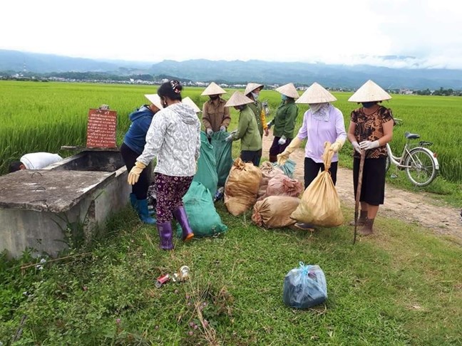 Hội viên phụ nữ thu gom rác thải, bao bì thuốc bảo vệ thực vật sau sử dụng, góp phần gìn giữ cảnh quan nông thôn xanh - sạch - đẹp. Ảnh: Hoàng Châu.