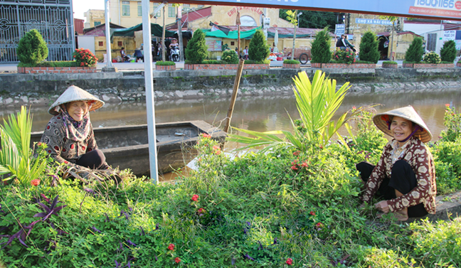 | Người dân xã Hải Quang, huyện Hải Hậu, tỉnh Nam Định chăm sóc đường hoa nông thôn mới kiểu mẫu. |