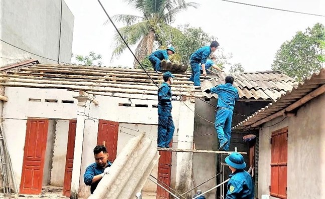 | Lực lượng dân quân xã Thái Hòa hỗ trợ gia đình bà Đỗ Thị Vinh, thôn Ngọc Hà tháo dỡ ngôi nhà cũ để xây mới |