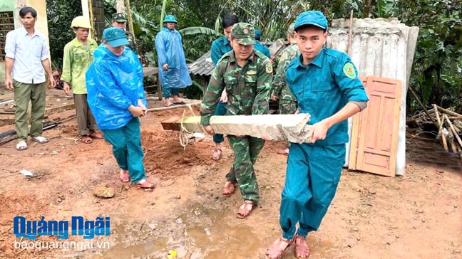 | Cán bộ, chiến sĩ lực lượng vũ trang tỉnh hỗ trợ người dân xã Mộ Đức (Quảng Ngãi) tháo dỡ nhà cửa để xây dựng nhà mới. Ảnh: TRỌNG QUỐC |