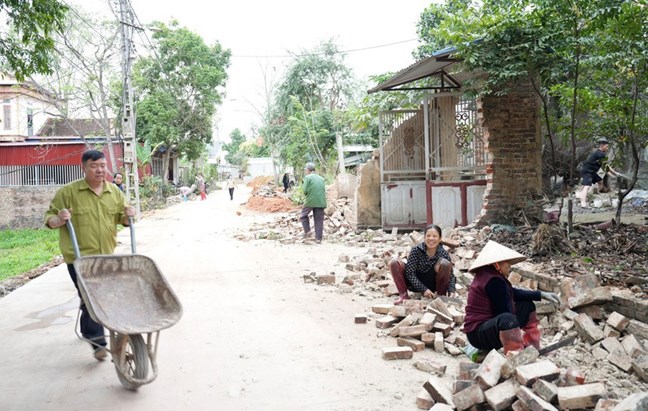 | Người dân tự nguyện hiến đất, tài sản trên đất và ngày công lao động để mở rộng đường NTM. |