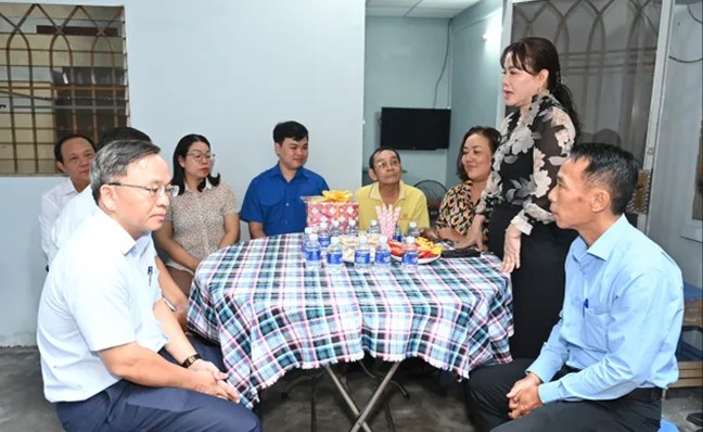 | Đại diện cấp ủy, chính quyền địa phương động viên hộ ông Trần Văn Em cố gắng ổn định cuộc sống |