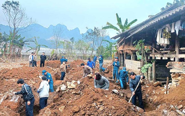 | Cán bộ, công chức, đảng viên, lực lượng dân quân, công an xã Phúc Ứng (Sơn Dương) hỗ trợ gia đình ông Mông Văn Hải, thôn Khuôn Ráng đào móng xây dựng nhà mới. |