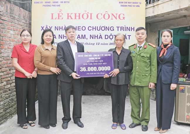 | Đại diện cán bộ, công chức, viên chức, người lao động phường Phù Khê trao hỗ trợ kinh phí xóa nhà tạm, nhà dột nát cho hộ bà Ngô Thị Sơn, khu phố Phù Khê Thượng. |