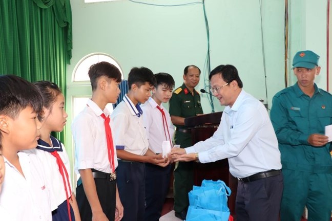 Ông Phan Hồng Ân, Phó Chủ tịch Ủy ban MTTQ Việt Nam thành phố Hồ Chí Minh tặng quà cho các em học sinh trên địa bàn