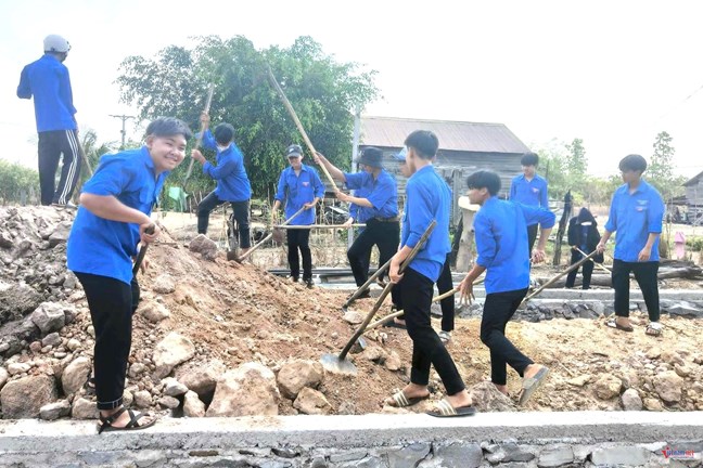 | Lực lượng đoàn thanh niên xã Ea Rốk chung tay xóa nhà tạm, nhà dột nát. Ảnh: Hải Dương |