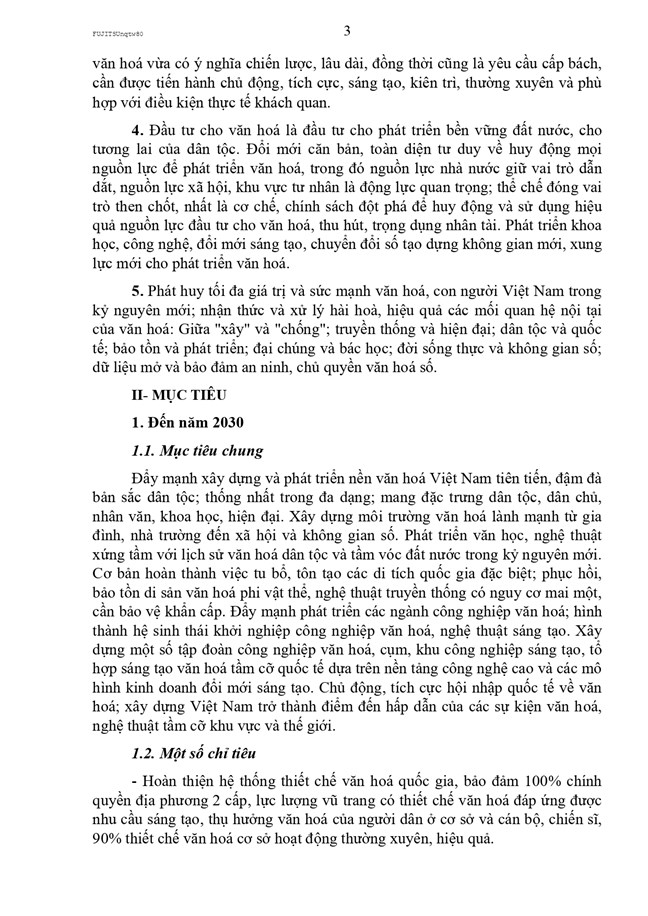 Nghị quyết đề ra mục tiêu đến năm 2030 xây dựng nền văn hóa Việt Nam tiên tiến, đậm đà bản sắc dân tộc; phát triển mạnh các ngành công nghiệp văn hóa; thu hẹp chênh lệch trong thụ hưởng văn hóa giữa các vùng, miền; từng bước hình thành các thương hiệu văn hóa, nghệ thuật, sáng tạo có tầm vóc khu vực và quốc tế. Tầm nhìn đến năm 2045 là xây dựng nền văn hóa Việt Nam xã hội chủ nghĩa, trong đó con người là trung tâm, chủ thể và mục tiêu của phát triển; văn hóa trở thành sức mạnh mềm nổi bật, góp phần khẳng định vị thế Việt Nam là quốc gia phát triển, có thu nhập cao.