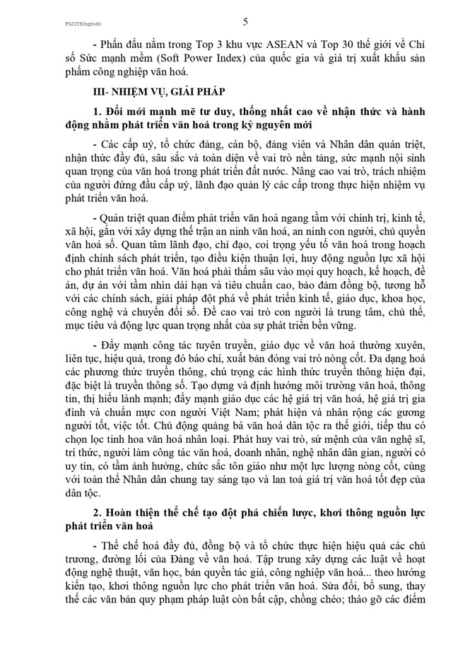 Để hiện thực hóa các mục tiêu đó, Nghị quyết xác định hệ thống nhiệm vụ, giải pháp toàn diện và đồng bộ, tập trung vào đổi mới tư duy phát triển văn hóa; hoàn thiện thể chế, chính sách đột phá; xây dựng con người Việt Nam phát triển toàn diện; phát triển mạnh công nghiệp văn hóa gắn với khoa học, công nghệ, đổi mới sáng tạo và chuyển đổi số; chủ động, tích cực hội nhập quốc tế về văn hóa.