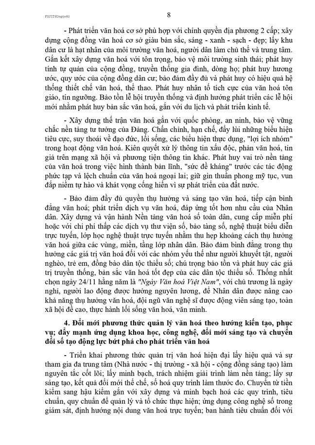 Đáng chú ý, Bộ Chính trị thống nhất chọn ngày 24/11 hằng năm là "Ngày Văn hóa Việt Nam", với chủ trương là ngày nghỉ, người lao động được hưởng nguyên lương, để nhân dân được nâng cao khả năng thụ hưởng văn hóa, đội ngũ văn nghệ sĩ được động viên sáng tạo, toàn xã hội đề cao, thực hành lối sống văn hóa, văn minh.