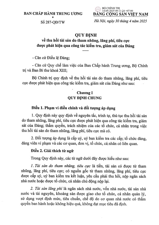 Toàn văn Quy định 287-QĐ/TW ngày 30/4/2025 của Bộ Chính trị về thu hồi tài sản do tham nhũng, lãng phí, tiêu cực được phát hiện qua công tác kiểm tra, giám sát của Đảng.