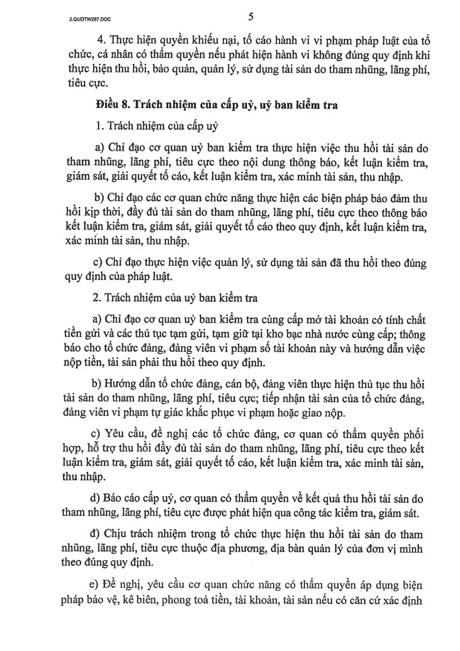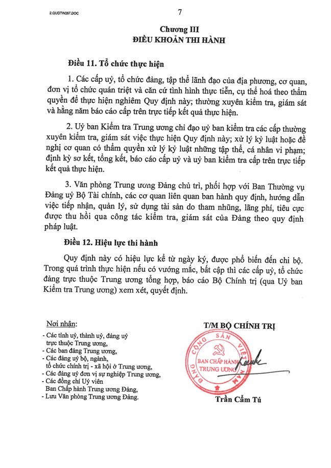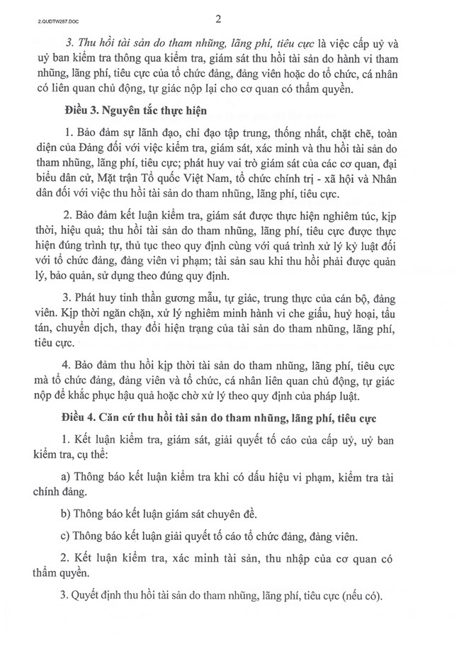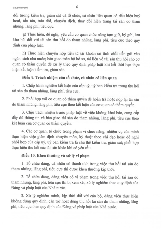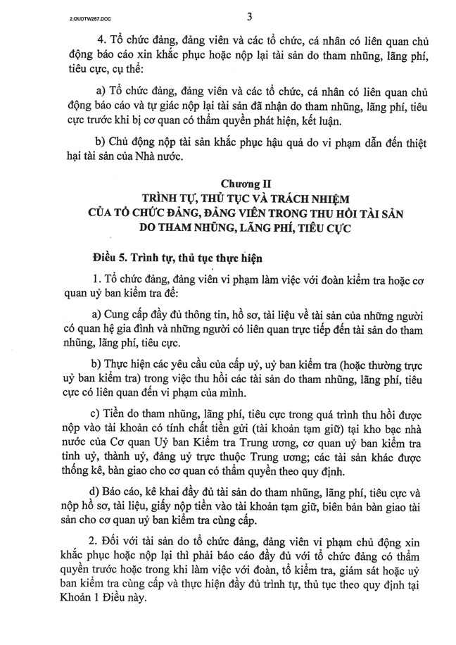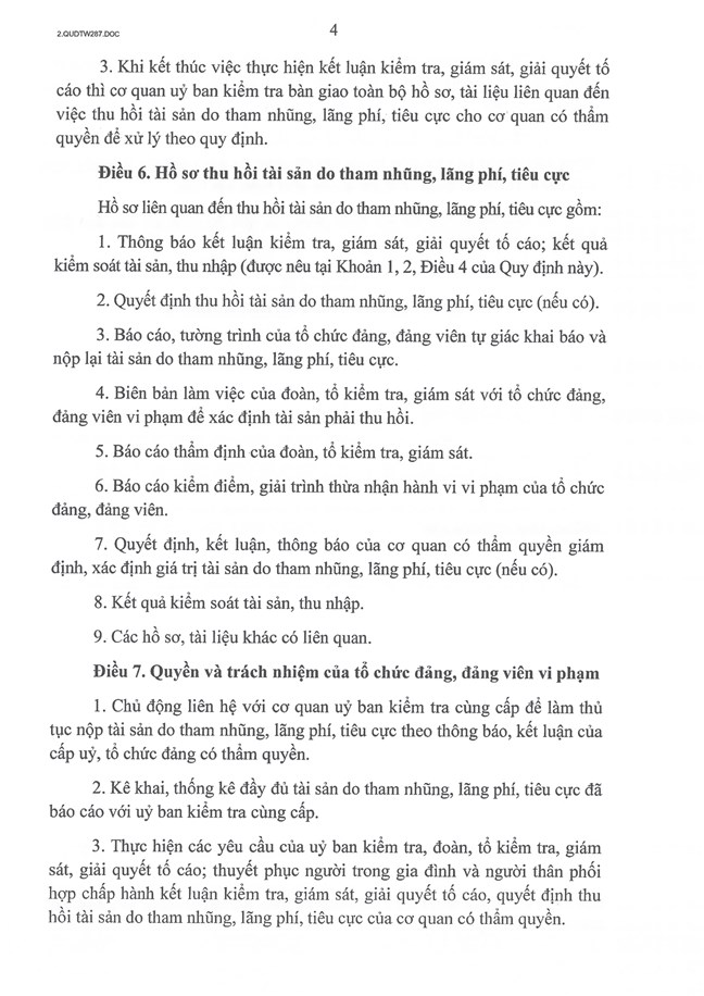 Theo đó, Quy định 287-QĐ/TW gồm 3 chương, 12 điều quy định về nguyên tắc, trình tự, thủ tục thu hồi tài sản do tham nhũng, lãng phí, tiêu cực được phát hiện qua công tác kiểm tra, giám sát của Đảng; thẩm quyền, trách nhiệm của các tổ chức, cá nhân trong việc thu hồi tài sản do tham nhũng, lãng phí, tiêu cực mà có.