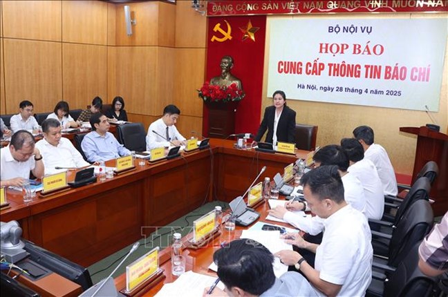 | Thứ trưởng Bộ Nội vụ Nguyễn Thị Hà chủ trì buổi họp báo. Ảnh: Văn Điệp/TTXVN |